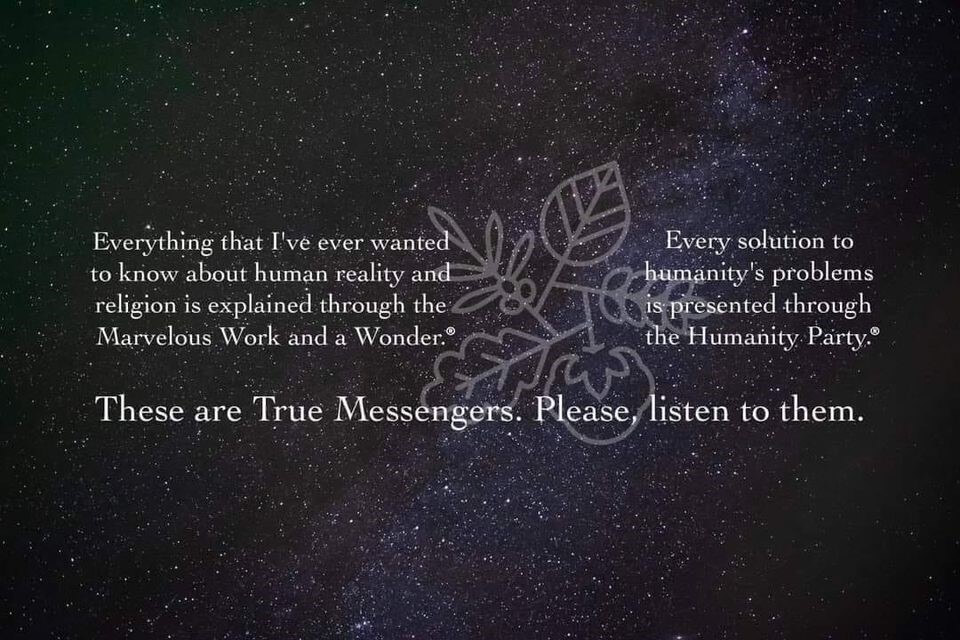 Thanks to this work, I have been able to truly look at all the humans like little children and accept and celebrate what makes them happy without judgment. Nothing, nothing could have persuaded me to leave the church but the Real Truth that I found in this work and that made more sense than anything else out there. We have met with our messenger on a few occasions and can assure from my experience that he is a very nice human being full of compassion for others around him. He has sacrificed so much to help our whole group of humans, even if the majority of us humans do not like or agree with the amazing information and plan he has presented to the world. He is truly the One like unto the Son of man, in religious terms. But he is as humble as can be, yet as a messenger he needs to use his two-edged sword language, in hopes that most of us wake up from the sleep we are in and try to think for ourselves. He is one of the True Messengers; if we listen to them, they will lead us in the way of life and salvation.